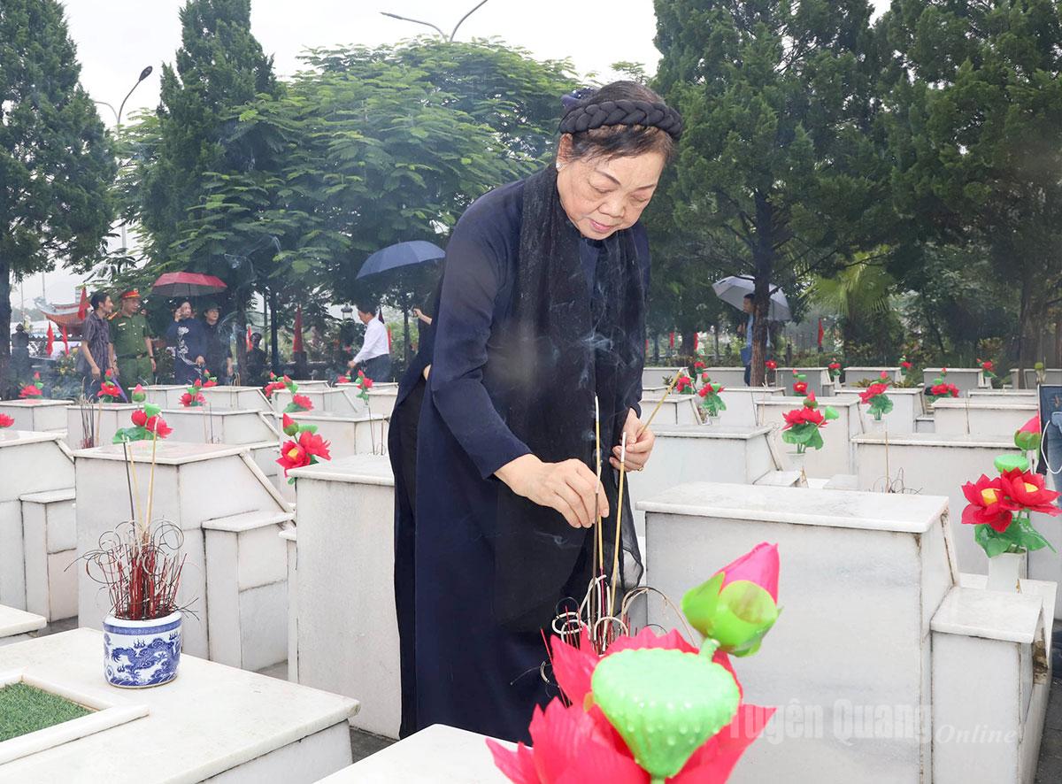 Nguyên Bí thư Trung ương Đảng, nguyên Trưởng ban Dân vận Trung ương, nguyên Bí thư Tỉnh ủy Tuyên Quang Hà Thị Khiết thắp hương phần mộ các Anh hùng liệt sĩ.