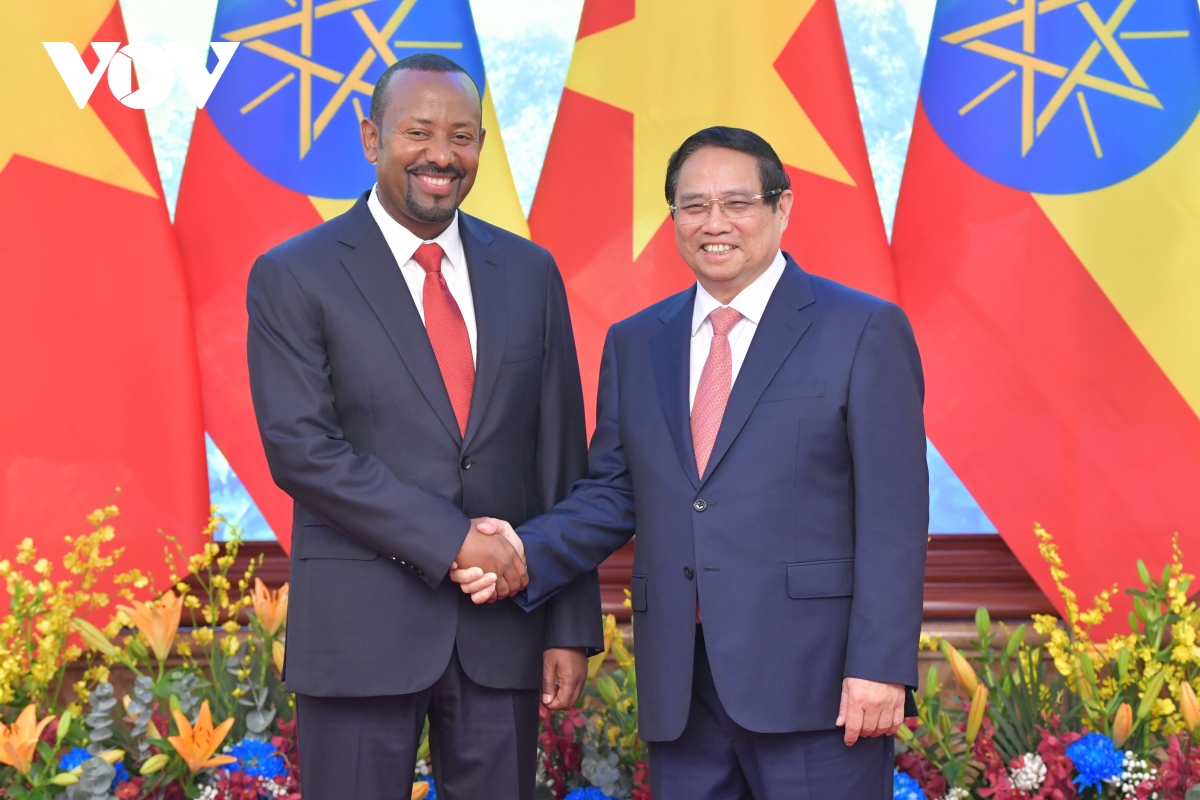 Từ 14-17/4, Thủ tướng Ethiopia Abiy Ahmed Ali và Phu nhân có chuyến thăm chính thức Việt Nam và tham dự Hội nghị thượng đỉnh Diễn đàn đối tác vì tăng trưởng xanh và mục tiêu toàn cầu (P4G) lần thứ tư. Đây là chuyến thăm Việt Nam đầu tiên của một lãnh đạo cấp cao Ethiopia kể từ khi hai nước thiết lập quan hệ ngoại giao năm 1976. Tại các cuộc tiếp, hội đàm, hội kiến, Lãnh đạo Việt Nam khẳng định Việt Nam luôn coi trọng quan hệ hữu nghị và hợp tác với các nước bạn bè châu Phi, trong đó có Ethiopia. Trong ảnh: Thủ tướng Phạm Minh Chính và Thủ tướng Ethiopia bắt tay trước khi tiến hành hội đàm.