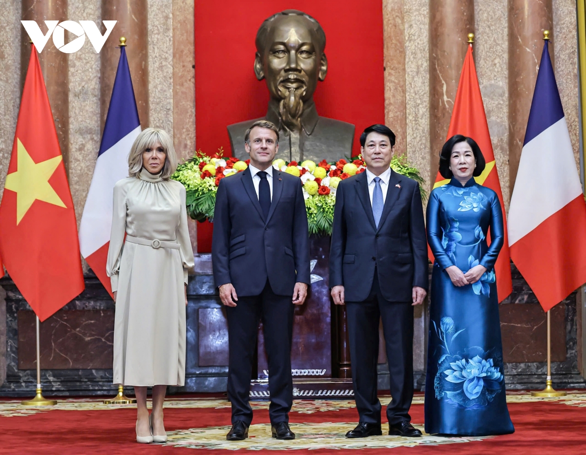 Từ 25-27/5, Tổng thống Pháp Emmanuel Macron và Phu nhân có chuyến thăm cấp Nhà nước tới Việt Nam. Đây là chuyến thăm Việt Nam đầu tiên của một Tổng thống Pháp từ gần 10 năm qua và cũng là trao đổi đoàn Lãnh đạo cấp cao đầu tiên giữa hai nước kể từ khi nâng cấp quan hệ lên Đối tác chiến lược toàn diện vào tháng 10/2024. Lãnh đạo hai nước đã ra Tuyên bố chung quyết tâm tiếp tục đưa quan hệ song phương đi vào chiều sâu, hiệu quả, đáp ứng nguyện vọng của nhân dân hai nước. Trong ảnh: Chủ tịch nước Lương Cường và Phu nhân cùng Tổng thống Pháp Emmanuel Macron và Phu nhân chụp ảnh chung.