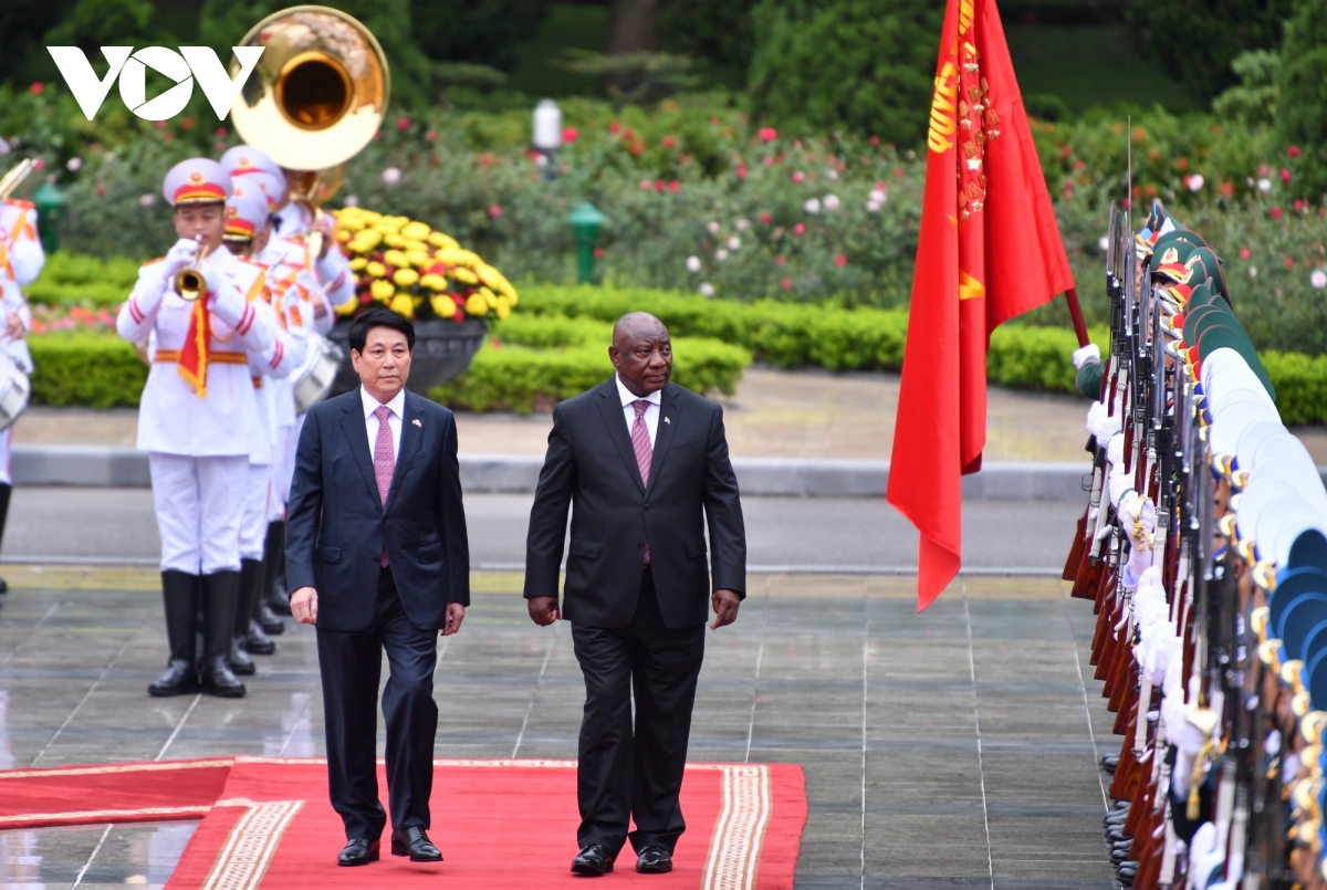 Từ 23-24/10, Tổng thống Nam Phi Matamela Cyril Ramaphosa có chuyến thăm cấp Nhà nước tới Việt Nam. Chuyến thăm không chỉ củng cố tình hữu nghị truyền thống mà còn mở ra cơ hội để lãnh đạo hai nước đánh giá toàn diện quan hệ hợp tác, định hướng thúc đẩy hợp tác kinh tế, thương mại, đầu tư, đồng thời khai thác các tiềm năng mới, hướng tới một quan hệ toàn diện, sâu sắc hơn trong tương lai. Trong ảnh: Chủ tịch nước Lương Cường chủ trì lễ đón Tổng thống Nam Phi Matamela Cyril Ramaphosa.