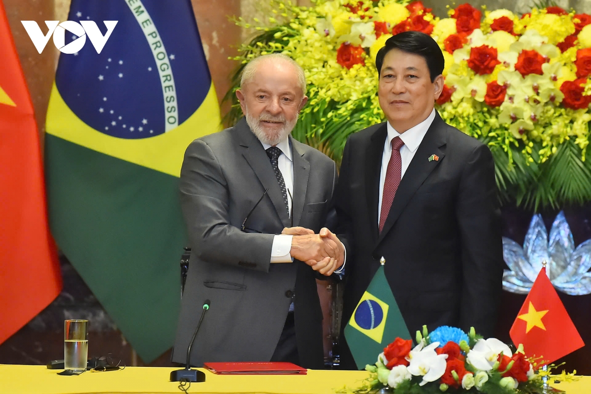 Từ 27-29/3, Tổng thống Brazil Lula da Silva có chuyến thăm cấp Nhà nước tới Việt Nam. Trong khuôn khổ chuyến thăm, lãnh đạo hai nước đã thống nhất các phương hướng quan trọng nhằm tăng cường quan hệ Đối tác chiến lược trên bình diện song phương và đa phương. Lãnh đạo hai nước cũng đã ra Tuyên bố chung. Trong ảnh: Chủ tịch nước Lương Cường và Tổng thống Brazil Lula da Silva bắt tay sau khi chứng kiến lễ ký kết và trao các văn kiện hợp tác song phương.
