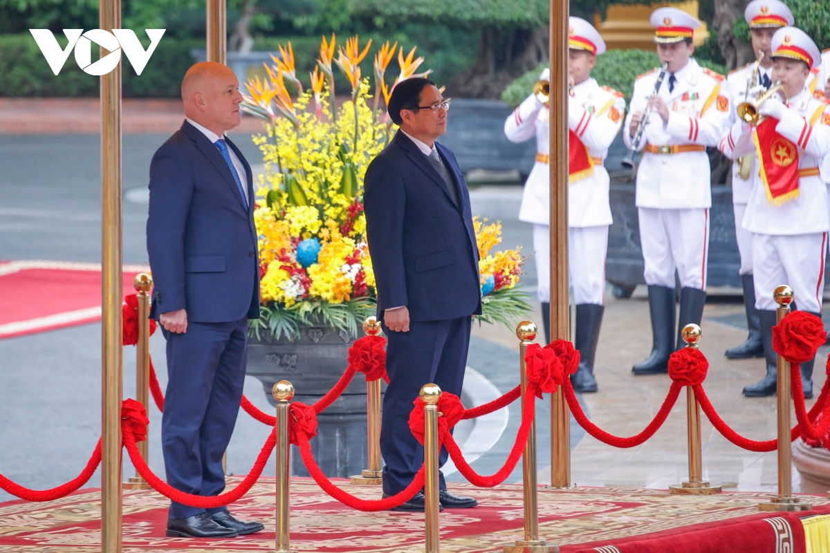 Từ 25-28/2, Thủ tướng New Zealand Christopher Luxon có chuyến thăm chính thức Việt Nam và dự Diễn đàn Tương lai ASEAN lần thứ hai. Chuyến thăm diễn ra đúng vào dịp hai nước kỷ niệm 50 năm thiết lập quan hệ ngoại giao. Trong khuôn khổ chuyến thăm, Việt Nam và New Zealand nhất trí nâng cấp quan hệ song phương lên Đối tác Chiến lược Toàn diện. Trong ảnh: Thủ tướng Phạm Minh Chính chủ trì lễ đón Thủ tướng New Zealand Christopher Luxon.