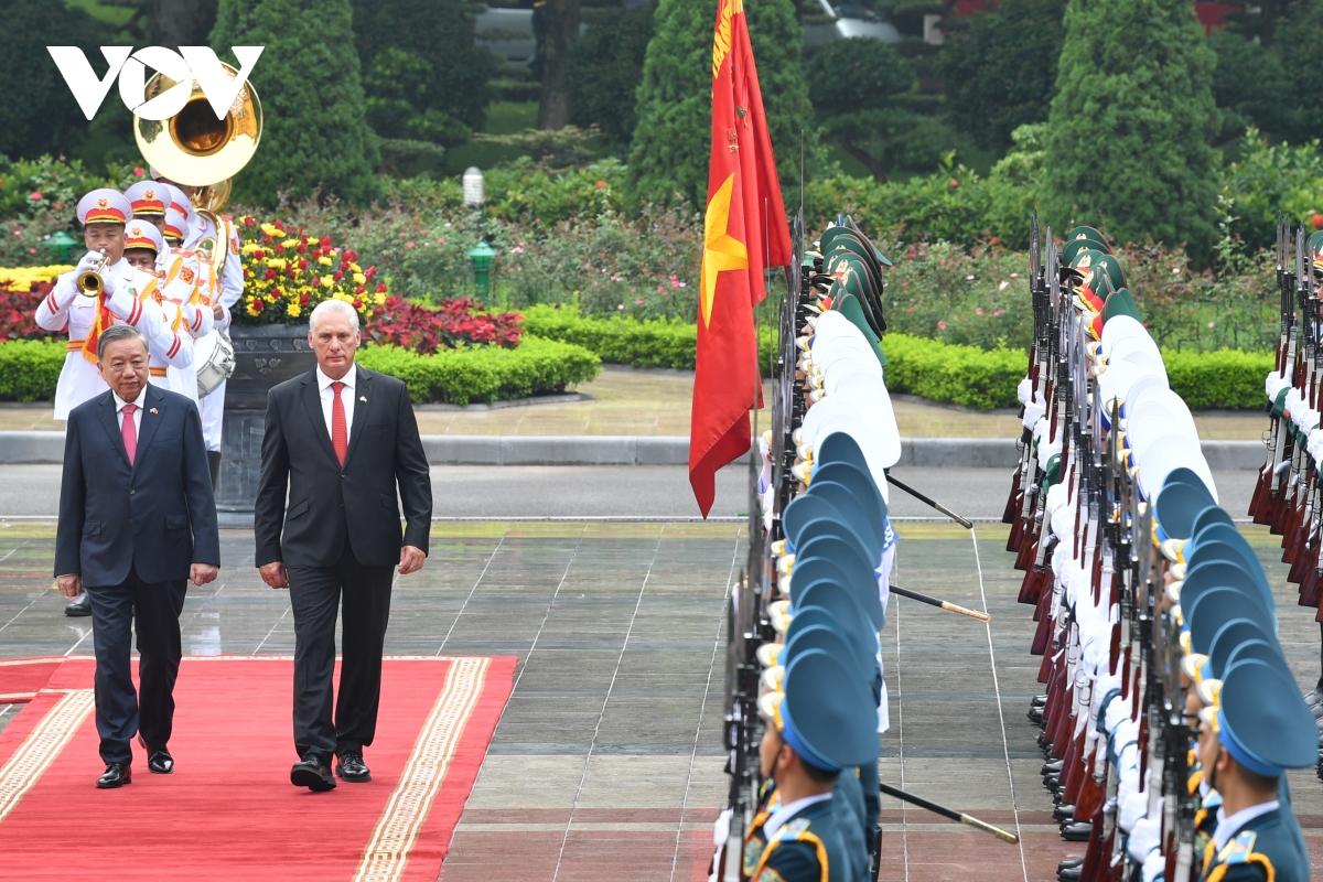 Từ 31/8-2/9, Bí thư Thứ nhất, Chủ tịch nước Cuba Miguel Díaz-Canel Bermúdez và Phu nhân có chuyến thăm cấp Nhà nước tới Việt Nam, dự Lễ kỷ niệm 80 năm Cách mạng tháng Tám thành công và Quốc khánh nước Cộng hòa xã hội chủ nghĩa Việt Nam. Chuyến thăm diễn ra đúng vào dịp hai nước tổ chức Năm hữu nghị Việt Nam - Cuba kỷ niệm 65 năm thiết lập quan hệ ngoại giao, đồng thời tạo dấu mốc quan trọng và động lực mạnh mẽ để tiếp tục củng cố, mở rộng, nâng tầm và làm sâu sắc hơn quan hệ đoàn kết truyền thống, hữu nghị đặc biệt và hợp tác toàn diện Việt Nam - Cuba. Trong ảnh: Tổng Bí thư Tô Lâm chủ trì lễ đón Bí thư Thứ nhất, Chủ tịch nước Cuba Miguel Díaz-Canel Bermúdez.