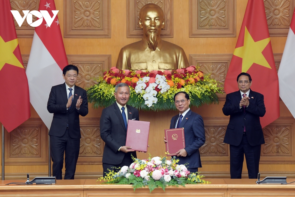 Từ 25-26/3, Thủ tướng Singapore Lawrence Wong và Phu nhân có chuyến thăm chính thức Việt Nam. Đây là hoạt động trao đổi đoàn cấp cao đầu tiên sau khi hai nước thiết lập quan hệ Đối tác Chiến lược toàn diện. Hai bên đã nhất trí về các biện pháp “quyết đoán, kịp thời” để gia tăng tin cậy chính trị, thúc đẩy triển khai các kết quả hợp tác cụ thể giữa hai nước. Hai bên cũng nhất trí duy trì lập trường chung của ASEAN trong vấn đề Biển Đông. Trong ảnh: Thủ tướng Phạm Minh Chính và Thủ tướng Singapore Lawrence Wong chứng kiến lễ trao Ý định thư về hợp tác xây dựng Chương trình hành động triển khai quan hệ Đối tác Chiến lược toàn diện giai đoạn 2025-2030 giữa Bộ Ngoại giao hai nước.